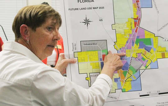 Pictured top: Town consultant Debbie Nickles(foreground) explains Century’s 2025 future land use map as council members Ann Brooks, Sandra McMurray Jackson, Jacke Johnston and Annie Savage look on. Pictured top inset: Century resident Leola Robinson listens as the map is explained. Pictured below: Consultant Debbie Nickles. NorthEscambia.com photos, click to enlarge.