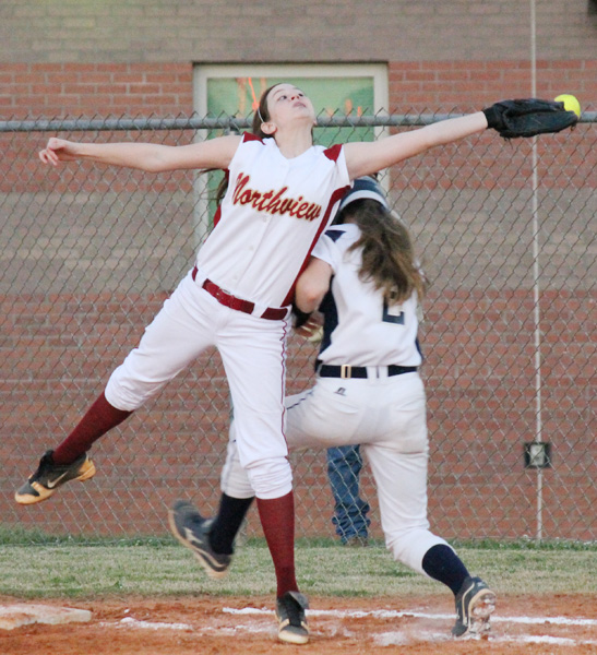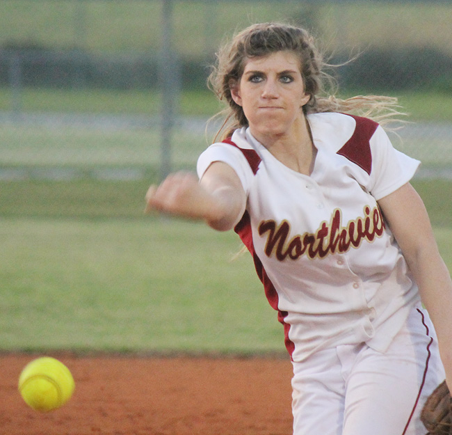 Pictured top: Lauren McCall defends second for the Northview Lady Chiefs as they take on Holmes Thursday in Bratt. Pictured inset: Misty Doran pitches for NHS. Pictured below: Mallory Ryan stretches for a catch at first base. NorthEscambia.com photos, click to enlarge.