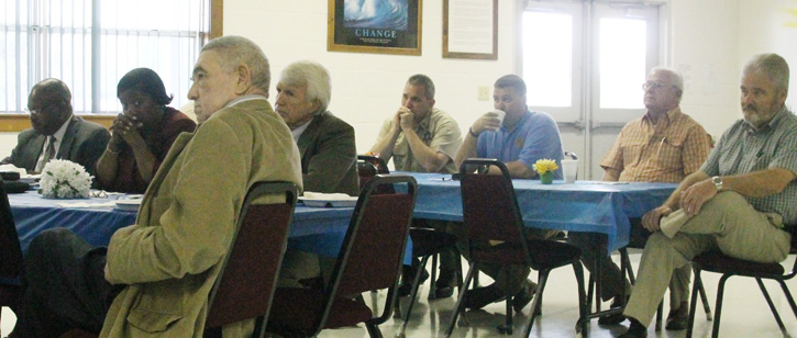 Pictured top: Century Correctional Institution Citizens Advisory Committee members and staff meet Thursday morning. Pictured inset: Warden Richard Comerford addresses the group. NorthEscambia.com photos, click to enlarge.