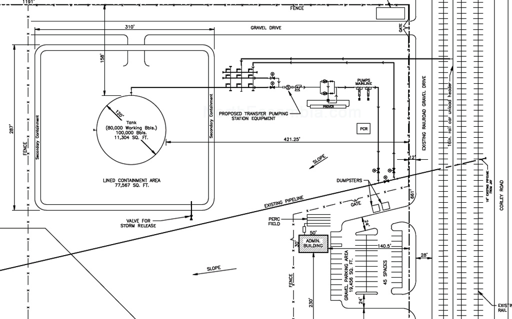 Plan drawings for the facility show that the large crude oil storage tank will be surrounded by a lined containment area designed to catch storm water runoff and, in a worse case scenario, any leak, preventing any contamination to the surrounding area. The facility will also include the pumping equipment, a 1,500 square foot administration building and a 45-space gravel parking lot.