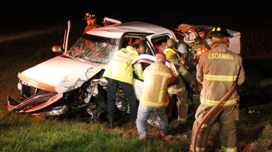 Pictured top: Kenneth Ray Spivey was trapped in this car in a two-vehicle wreck February on Highway 97 near Walnut Hill. Pictured inset and below: Firefighters use the Jaws of Life to free two people from this pickup. NorthEscambia.com file photos, click to enlarge.