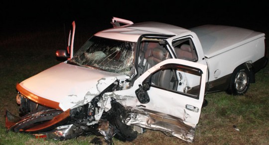 The car came to rest in the southbound lane of Highway 97; the pickup came to rest in a nearby ditch.