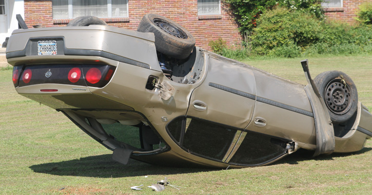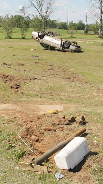 The accident happened about 2:30 p.m. just south of Arthur Brown Road and Ernest Ward Middle School. The driver of a Chevrolet Impala was northbound on Highway 97 when he lost control, ran off the road, hit a driveway, struck a mailbox and overturned into the front yard of a home. The driver was not injured; there were no passengers in the vehicle. The driver said he lost control due a smaller spare tire on the front of the vehicle.