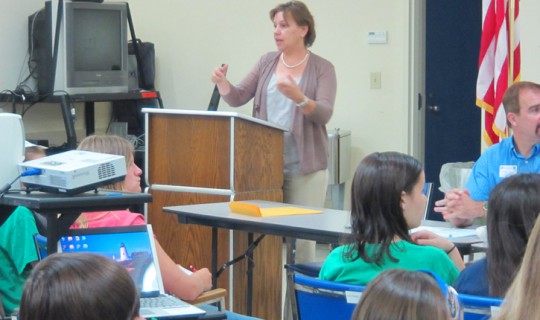 Pictured top: Pamela Allen, director of the Escambia County Extension Service, addresses member of the 4-H County Council Tuesday. Pictured inset: Dave Timberlake of the Escambia County 4-H Foundation discusses the sale of 4-H property to Navy Federal Credit Union during a meeting late Tuesday afternoon at the Escambia County Extension Office. Photos for NorthEscambia.com, click to enlarge.