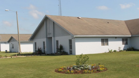 Library. Chapel. Security. — neat, hand lettered signs are above the doors of each building. A “Town of Century” water tower close behind the buildings. It really looks more like small town USA than a prison. If you overlook the bars on the windows. Especially on the Chapel.