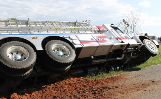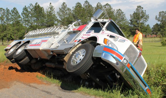 A Nokomis (Ala.) Volunteer Fire Department tanker truck came to rest in a ditch on Johnson Road while the driver was responding to a reported brush fire. Tires on the passenger side of the tanker truck were a few feet into the air, while the driver’s side of the vehicle came to rest on a ditch embankment which prevented the truck from rolling over.