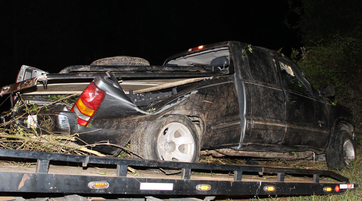 Pictured top: A Bratt teen’s pickup truck came to rest upside down deep in a wooded area in a Thursday night wreck. Pictured below: The truck after it was pulled from the wooded area. NorthEscambia.com photos, click to enlarge.