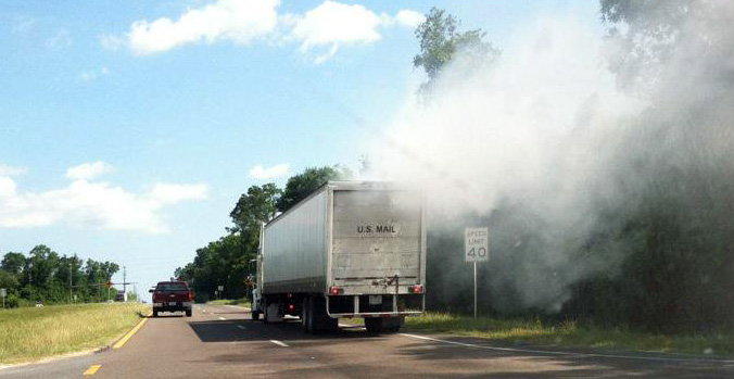 The Cantonment Station of Escambia Fire Rescue responded Friday afternoon after the U.S. Mail truck seen in this photo was reported to be on fire as it traveled along Highway 29. Multiple people reported that the trailer of the truck was on fire. When the vehicle stopped and firefighters caught up with it, they discovered the excessive smoke was an engine issue, not a fire. Reader photo by Bradd Gibbs for NorthEscambia.com, click to enlarge.
