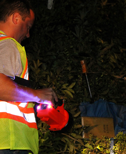 Pictured above and below: A single vehicle crash early Tuesday morning on Highway 97 south of Walnut Hill. Pictured inset: Firefighters were able to find a Bible and an umbrella in a nearby wooded area, but no driver. NorthEscambia.com photos, click to enlarge.