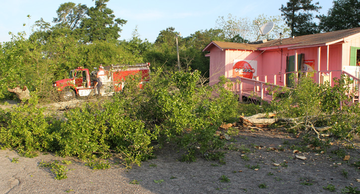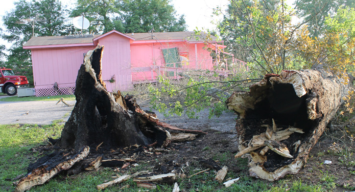 The tree fell into the parking lot of the State Line O’Yes Lotto on Highway 97 at the Alabama state line about 7:10 a.m., taking down a power line but sparing the pink building. The business was not open at the time.