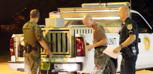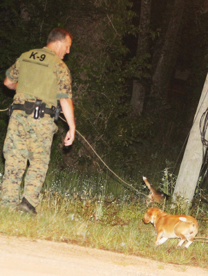 Pictured top: The Southern Pit Stop convenience store in Century was robbed at gunpoint the night of April 2. Pictured inset: Tracking dogs from Century Correctional Institution begin their search for the suspect. Pictured below: The K-9 unit prepares to search shortly after the armed robbery. NorthEscambia.com photos, click to enlarge.