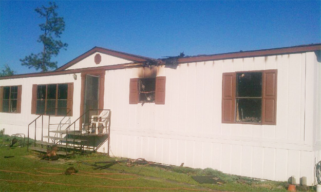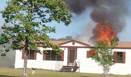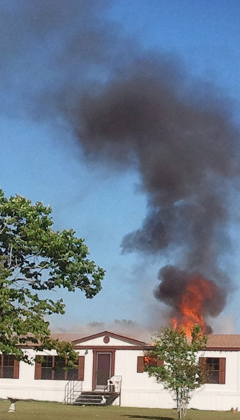 Pictured above and inset: Fire ripped through the roof of this mobile home on White Ash Road near Molino Thursday afternoon. Submitted photos by Sabrena Padgett for NorthEscambia.com, click to enlarge. Pictured below: The mobile home following the fire. Submitted photos for NorthEscambia.com, click to enlarge.