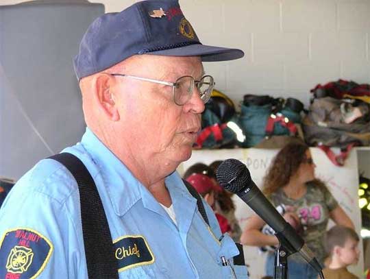 Pictured top: Robert Stewart teaches fire safety to students at Bratt Elementary School in October, 2011. Pictured inset: Robert Stewart speaks at a 2009 Walnut Hill Volunteer Fire Department event. NorthEscambia.com file photos, click to enlarge.