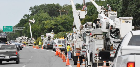 Pictured top: Gulf Power workers help with power restoration near Baltimore last year following Hurricane Irene. NorthEscambia.com file photo, click to enlarge.