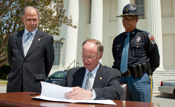 Pictured top: Alabama Gov. Robert Bentley signs into law a measure that prohibits texting while driving. Alabama Rep. Jim McClendon (left) and Alabama Public Safety Director Colonel Hugh McCall look on as the governor signs the bill Tuesday in Montgomery. Photo for NorthEscambia.com, click to enlarge.