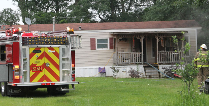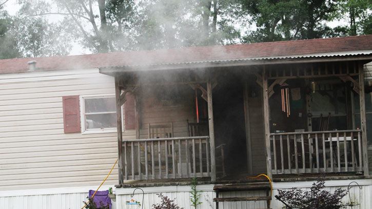 Pictured above: Smoke pours from the front of the mobile home before the first fire trucks arrive at a kitchen fire Tuesday evening in Davisville. Pictured inset: Firefighters pull a hose into the mobile home. Pictured below: The fire caused minor damage. NorthEscambia.com photos, click to enlarge.