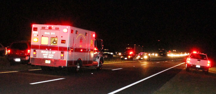 Pictured above: Emergency workers on scene of a fatal accident Sunday night in Molino where multiple vehicles hit a horse. NorthEscambia.com photo, click to enlarge.
