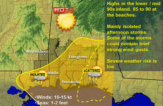 - Friday: A 40 percent chance of showers and thunderstorms. Partly sunny, with a high near 87. Southwest wind between 5 and 10 mph.