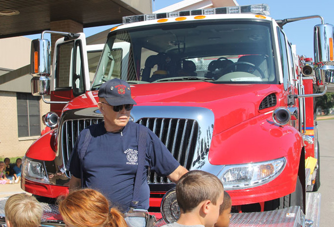 Pictured top: Retired Walnut Hill Volunteer Fire Department Chief Robert Stewart and his grandson Drew (”Little Man”) Kennedy watch from the sidelines at an accident on Pine Barren Road. Pictured top inset: Stewart receives a large plaque with his helmet during a retirement reception. Pictured bottom inset, Stewart is honored by the Walnut Hill VFD. Pictured below: Robert Stewart teaches fire safety to students at Bratt Elementary School in October 2011. NorthEscambia.com photos, click to enlarge.