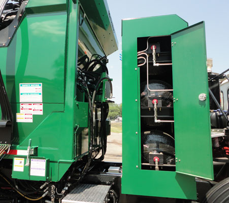 Instead of one large 80- gallon diesel tank on each sanitation truck, the new CNG trucks have three 25-gallon compressed natural gas tanks. The tanks are stacked between the cab and body or on the top of the body depending on the type of collection vehicle.