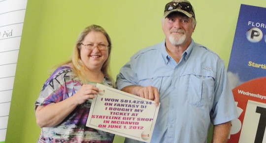 Pictured: Freddie Smitherman of Clanton, Ala., poses with his wife Thursday after claiming his winnings at the Florida Lottery District Office in Pensacola. He purchases his winning ticket in the June 1 drawing in North Escambia. Submitted photo for NorthEscambia.com, click to enlarge.