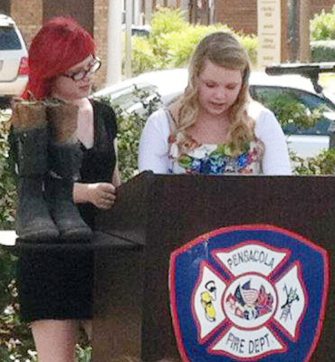 Pictured top: Family members of fallen firefighter Vista Spencer Lowe with a memorial unveiled Tuesday in his honor at Seville Square. Pictured inset: Northview graduates Lauren (left) and Jennifer Lowe read “The Fireman’s Prayer” Tuesday morning as a memorial was dedicated to their grandfather. The boots he was wearing the night of his demise are seen on the left of the podium (courtesy P.C. Wu). Courtesy photos for NorthEscambia.com, click to enlarge.