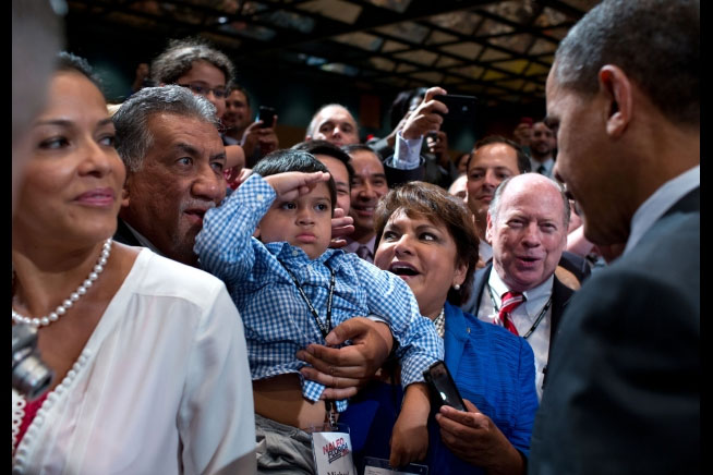 Pictured top and inset: President Barack Obama speaks in Orlando Friday. Pictured bottom inset: A young boy along the rope line in Orlando salutes Obama after the President spoke at the NALEO Conference. Photos for NorthEscambia.com, click to enlarge.