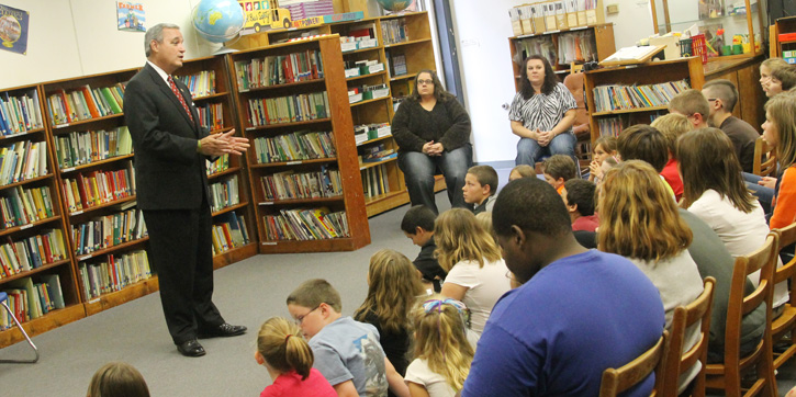 Pictured top: Byrneville Elementary School Principal Dee Wolfe-Sullivan addresses the Escambia County School Board during a workshop meeting Thursday morning. Pictured top inset: Byrneville Elementary School. Pictured bottom inset: Congressman Jeff Miller speaks to students inside the now damaged Byrneville Elementary media center. Courtesy photo for NorthEscambia.com, click to enlarge.