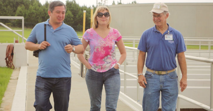 Pictured top: An international delegation from Kazakhstan tours the ECUA Central Water Reclamation Facility in Cantonment Thursday afternoon. Pictured below: Eldar Kildibayev, deputy head, Department of Natural Resources and Environmental Management, Almaty; Taissiya Kogutyuk, director general, Kazakhstan Kagazy; and Larry Walker, ECUA District 5 board member. Submitted photos for NorthEscambia.com, click to enlarge.