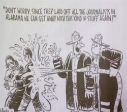 Last Saturday, the newspaper published the cartoon by Andy Marlette, that depicts two apparently white firefighters hosing down two black persons. The caption on the carton states: “Don’t worry, since they laid off all the journalists in Alabama we can get away with this kind of stuff again.”