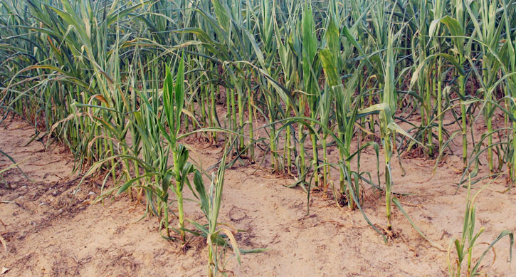 Pictured above: Water standing between rows in a Walnut Hill field Monday afternoon. Pictured below: Dry, parched corn in Walnut Hill prior to the rains. NorthEscambia.com photos, click to enlarge.