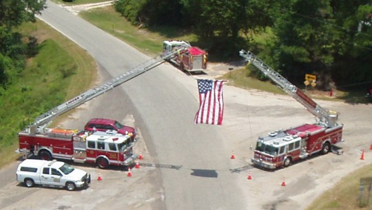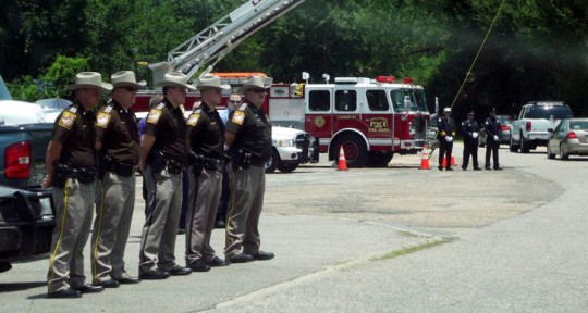 Pictured top: Ladder trucks from Pace and Century fly a giant American flag over the funeral procession for firefighter and paramedic Nathan Berry Tuesday afternoon. Pictured inset: Chief Tommy Wilkerson of the Friendship Volunteer Fire Departments offers a final salute to Berry. Pictured below: Deputies from the Escambia County (Ala.) Sheriff’s Office stand at attention as the funeral procession passes. Aerial photos by Steve Stanton, ground level photos by Katie Fowler for NorthEscambia.com, click to enlarge.