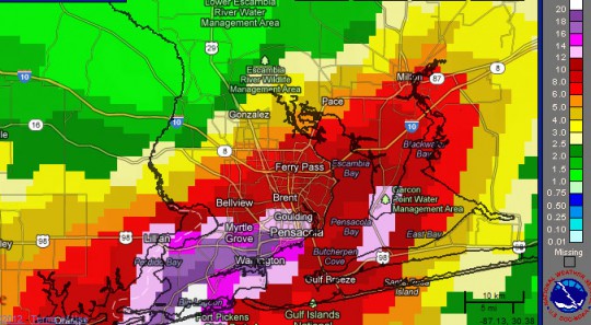 Pictured: This graphic from the National Weather Service shows rainfall amounts in southern Escambia County. Click to enlarge.