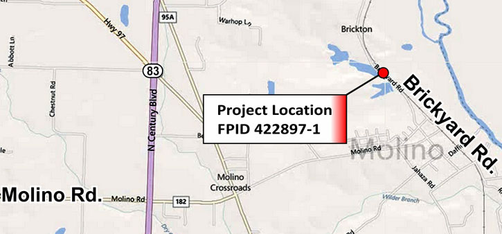 The project involves replacing an existing bridge on Brickyard Road, repaving the approaches, new guardrail, minor drainage improvements, sodding and placement of new pavement markings. The project is approximately 700 feet in length with construction scheduled to begin in the summer of 2014. During construction, the roadway will be closed and traffic diverted. Additional right-of-way will be required for the bridge and roadway improvements.