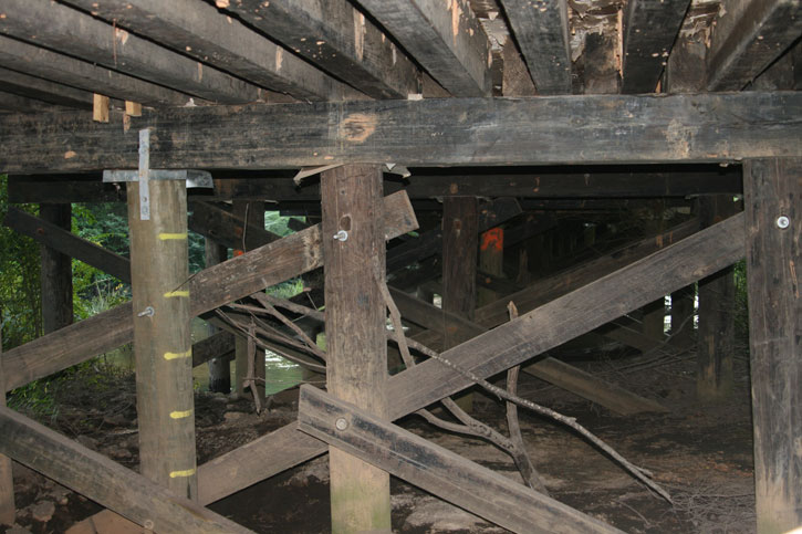 Pictured top and inset: The Highway 4 bridge at Canoe Creek, constructed in 1942 was inspect Monday morning. Replacing the bridge would cost the county an estimated $2.59 million. Pictured below: The wood structure of the bridge on Lambert Bridge Road near Walnut Hill. Replacing the bridge would cost an estimated $2.24 million. NorthEscambia.com photos, click to enlarge.