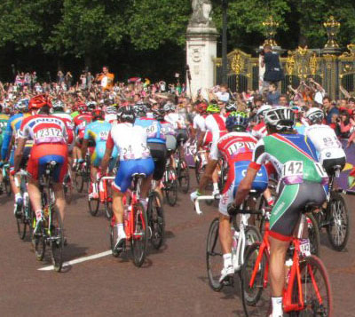 Pictured above and inset: The men’s cycling road race as seen from The Mall outside Buckingham Palace during the London 2012 Olympic Games. Pictured below: Team USA’s vehicle. NorthEscambia.com photos, click to enlarge.