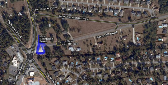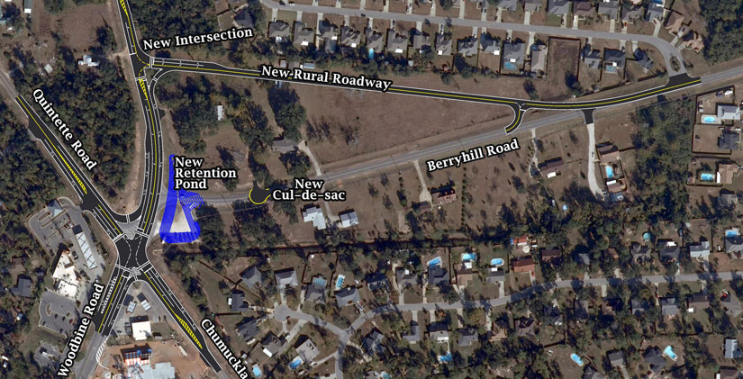 The improvements include realigning Berryhill Road from Ashmore Lane to Chumuckla Highway. The realignment will move the current intersection approximately 500 feet to the north and create a two lane rural roadway section north of Berryhill Road connecting to Chumuckla Highway. Other project features include creation of a new retention pond and widening of the right turn and merge lanes on both Quintette Road and Chumuckla Highway.