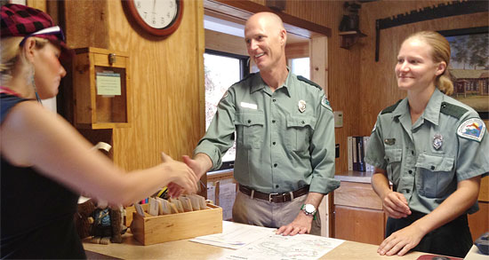 Scott continued his workday by opening the ranger station and greeting visitors. Later, he checked on campers, ensuring guest safety by monitoring the pool area and working with a concessionaire to serve food and rent equipment to park visitors.
