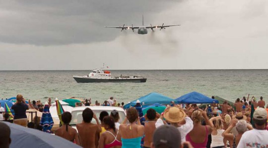 Pictured top: The Blue Angels please the crowd Saturday at Pensacola Beach. Pictured below: “Ernie”, a C-130 filling in for the famous Fat Albert, approaches Pensacola Beach. Photos by Ditto Gorme for NorthEscambia.com, click to enlarge.