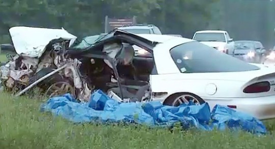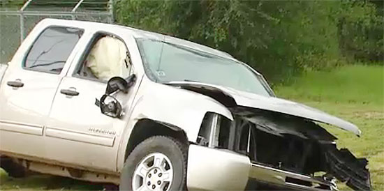 Pictured top and inset: A Jay High School graduate driving this Camaro died Tuesday afternoon when he drove into the path of a pickup truck (pictured below) on Chumuckla Highway. Photos courtesy WEAR 3 for NorthEscambia.com, click to enlarge.