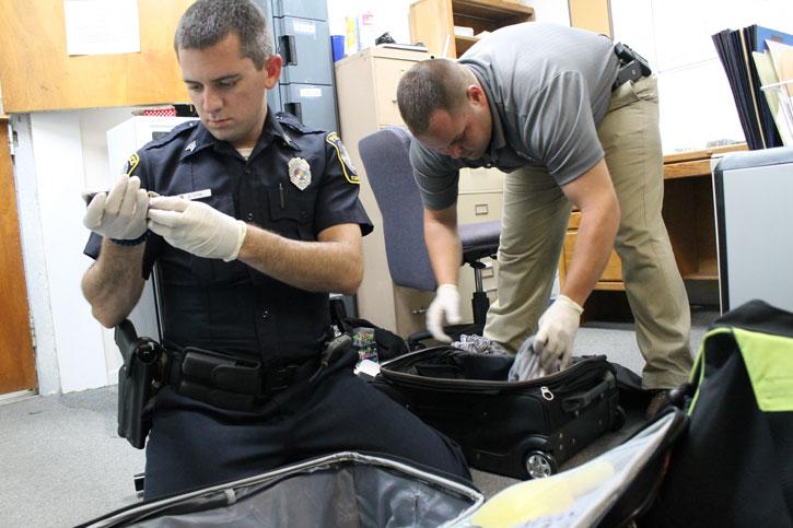 Pictured top: Flomaton Police officer Chris Neal with over $46,000 in cash seized during a traffic stop Tuesday evening. Pictured inset: Part of the cash was discovered during this search of luggage belonging to the suspects. Pictured bottom inset: The 2010 Dodge Challengers stopped by the Flomaton Police Department. Pictured below: A portion of the cash, cocaine and marijuana (in foreground) seized. NorthEscambia.com photos, click to enlarge.