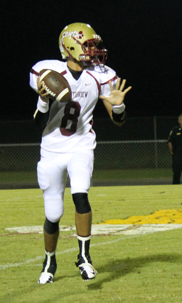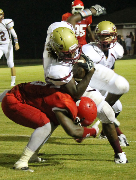 Pictured top: Senior Neiko Robinson picks up yardage for the Northview Chiefs Friday night against Panama City Bay. Pictured top inset: LaMikal Kyles on gain for NHS. Pictured bottom inset: Backup Northview QB Daulton Tullis, a junor. NorthEscambia.com photos, click to enlarge.