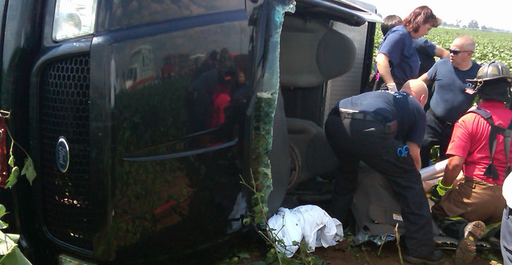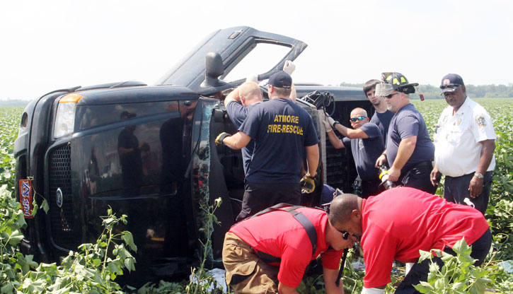Pictured above and below: Firefighters use the Jaws of Life to free the river from this overturned truck. Pictured inset: The truck came to rest on its side in a cotton field. NorthEscambia.com photos, click to enlarge.