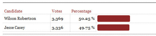 The final count for Robertson was 3,369 votes (50.24%) to Casey’s 3,337 votes (49.76%).