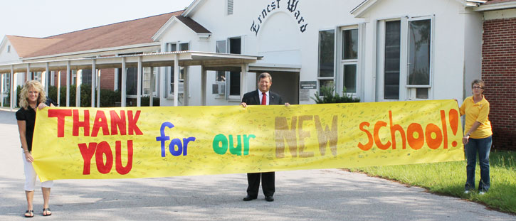 Pictured top: Escambia School Superintendent Malcolm Thomas and Ernest Ward Principal Nancy Perry discuss options for the new school campus. Pictured below: Perry, Thomas, and EWMS staffer Betty Coon hold a “Thank You for our New School” banner signed by Ernest Ward students during the 2011-2012 school year. NorthEscambia.com photos, click to enlarge.
