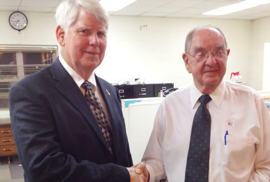 Pictured top: Atmore mayor-elect Jim Staff (left) is congratulated Tuesday night by Mayor Howard Shell (right). Photo by Emilie Mims for NorthEscambia.com, click to enlarge.