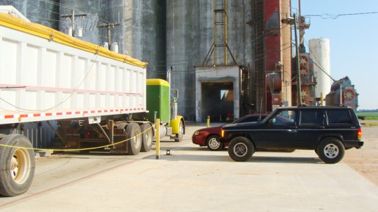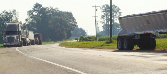 Pictured above: A load of corn is weighed Sunday morning at Escambia Grain in Walnut Hill. Pictured below: Trucks line up along Arthur Brown Road waiting to unload. Photos for NorthEscambia.com, click to enlarge.