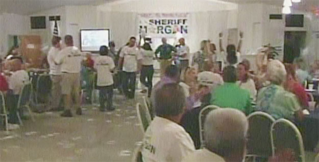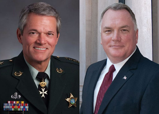 Pictured top, inset: Escambia County Sheriff David Morgan and his supporters celebrate a primary win Tuesday night. (Courtesy WEAR 3). Pictured below: Morgan (right) and challenger John Powell.