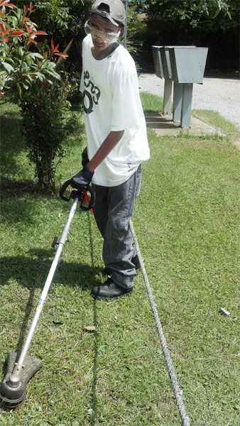 Pictured top: By the time Abdul Smith (right) and Antwon Lyons are done, over 150 yards in Escambia County will be mowed to avoid code enforcement violation fineds. Pictured bottom: Javier Cobb has learned that an important task of the Weed Easter operator is to look for uncut grass in a customer’s yard that was missed by the mower operator. Photos for NorthEscambia.com, click to enlarge.