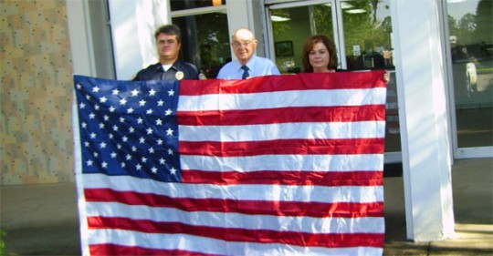 The Woodman of the World Lodge 1872 presented an American flag to the city of Atmore Tuesday morning to honor those who lost the lives on September 11, 2001. Pictured are Atmore Police Chief Jason Dean, Mayor Howard Shell and Samantha Bennett, Woodman of the World Lodge 1872 secretary. Submitted photo for NorthEscambia.com, click to enlarge.